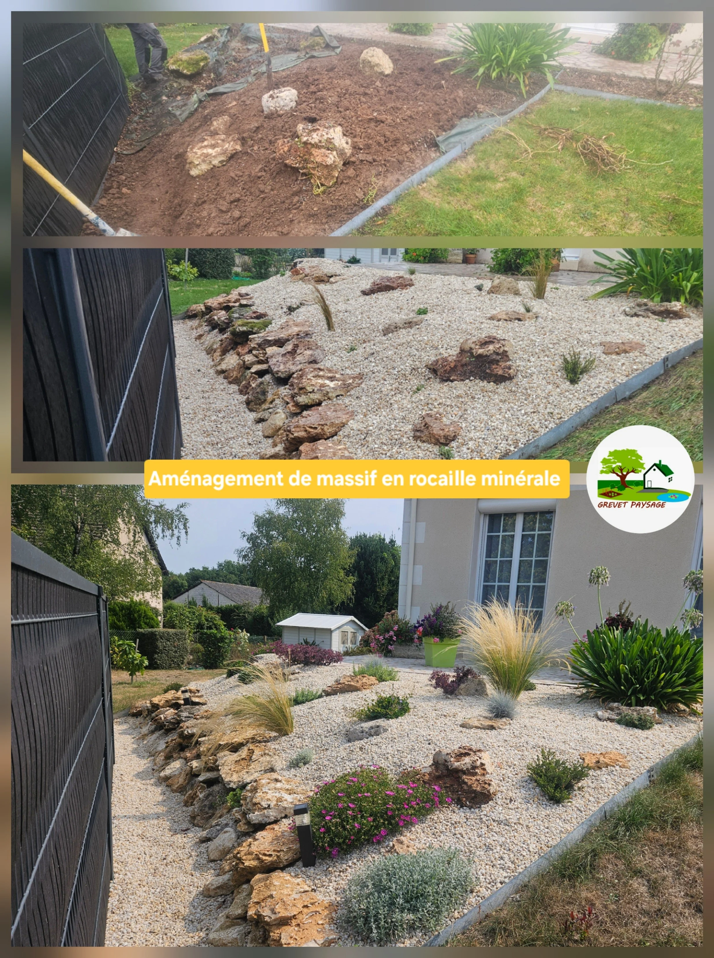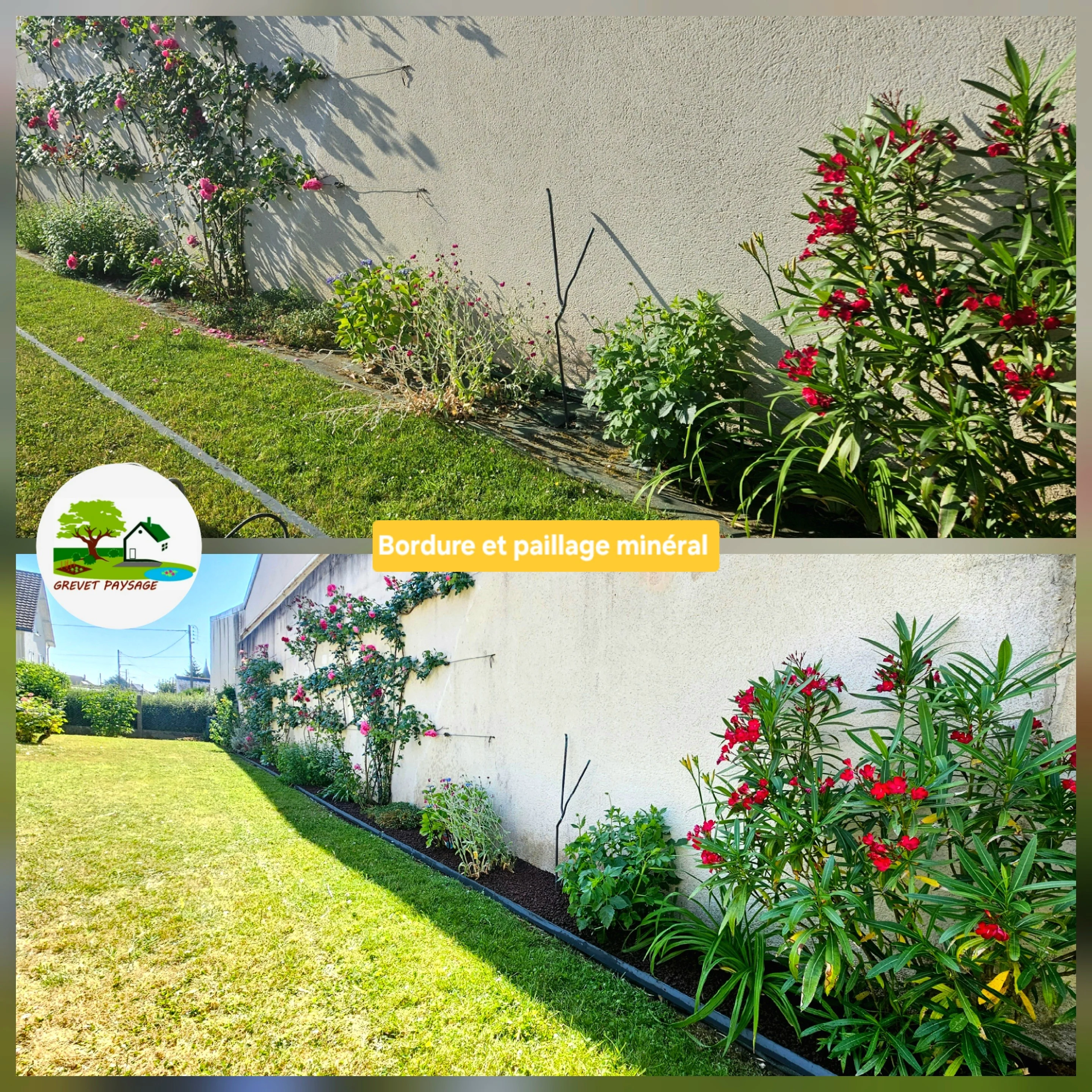 Bordurette et bordure pavé, toile tissée, paillage minéral, plantation