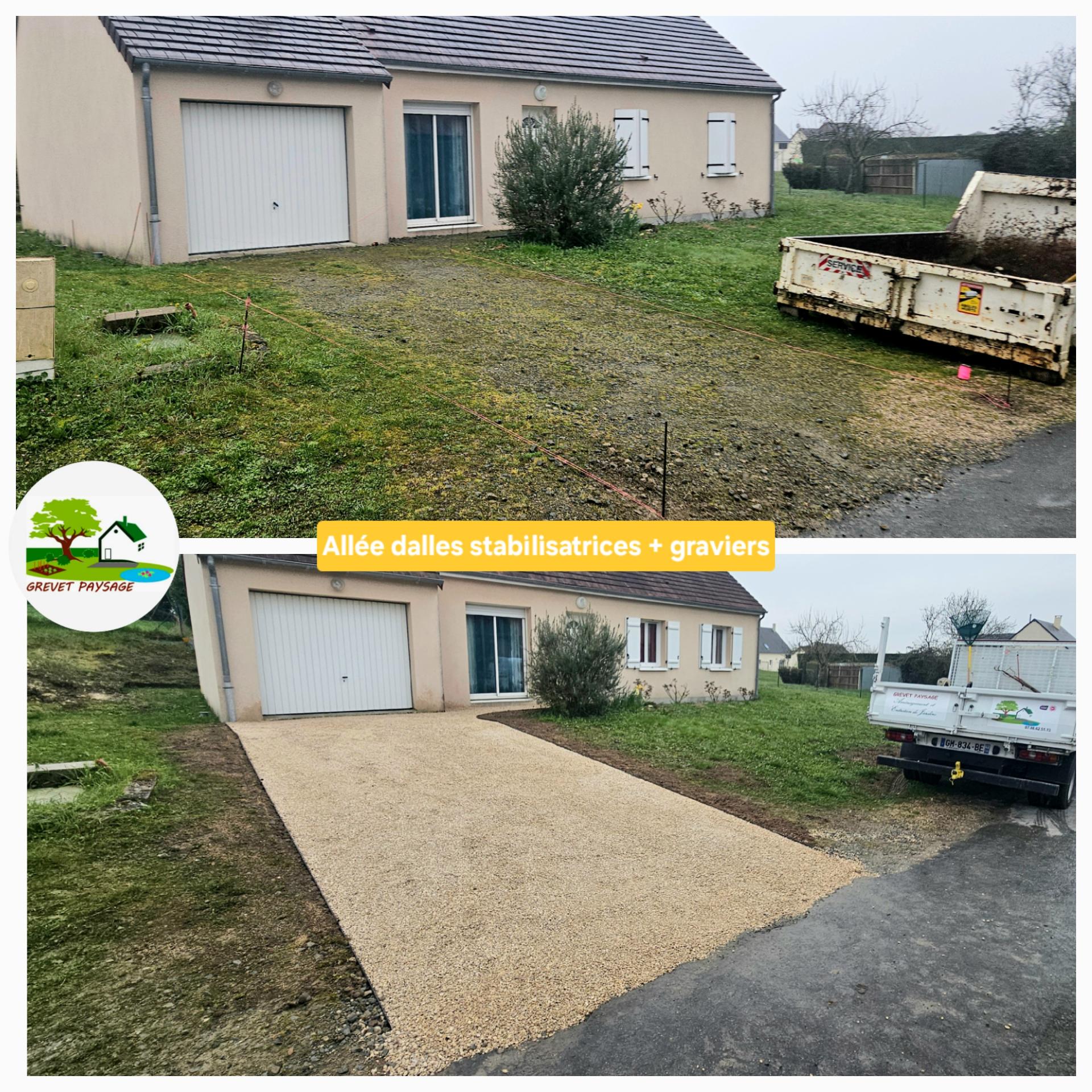Engazonnement, bande de propreté en pavé travertin et gravier marbre, raccord de brande